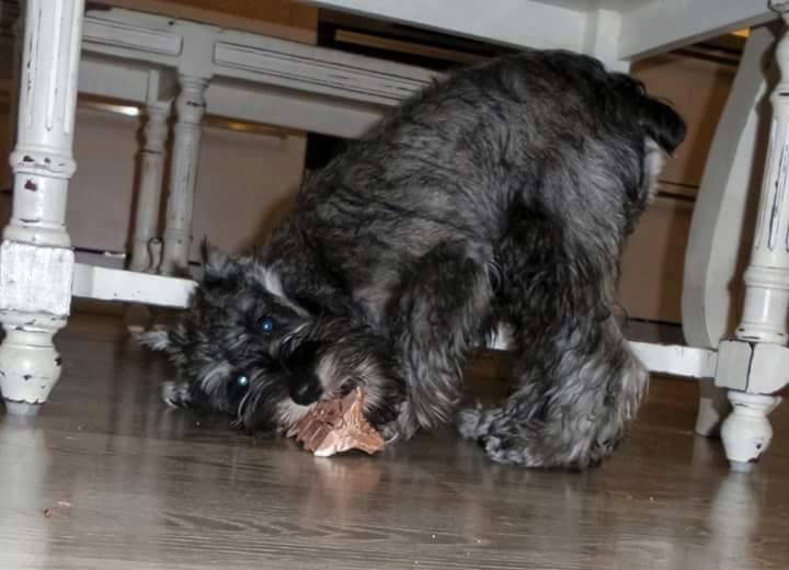 Hansu on lupaavarakenteinen, näyttävä ja karkeakarvainen snautserinalku jonka tehtävänä tällä hetkellä kasvaa tasapainoiseksi koiraksi valvovien silmiemme alla.