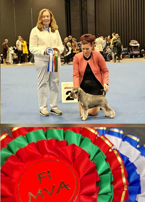 Helsinki Winnerissä tuomaroimassa Leni Finne. Nano onnistui ensimmäisessä näyttelyssään kaksivuotissynttäreiden jälkeen hienosti AVO ERI1, SA, PN3, SERT >>> uusi Suomen, Tanskan ja Liettuan muotovalio ja siten Demoni tunnetaan virallisesti jatkossa C.I.B.-J, FI, DK & LT MVA, FI JMVA, BALT, EE, LV & LT JMVA, KBHJV-24, KBHV-24, RIGAJW-24, HeJW-24, TLN JunWCup-25, TLN WCup-25, LT JW-25, TLNJW-25 Xtravaschnauza Chimichanga! Tästä sitten vuonna 2026 kohti uusia tavoitteita – Nannelia kivempaa harrastuskaveria ei voisi ollakaan joten kaikenlaiseen toivottavasti ehditään vielä.